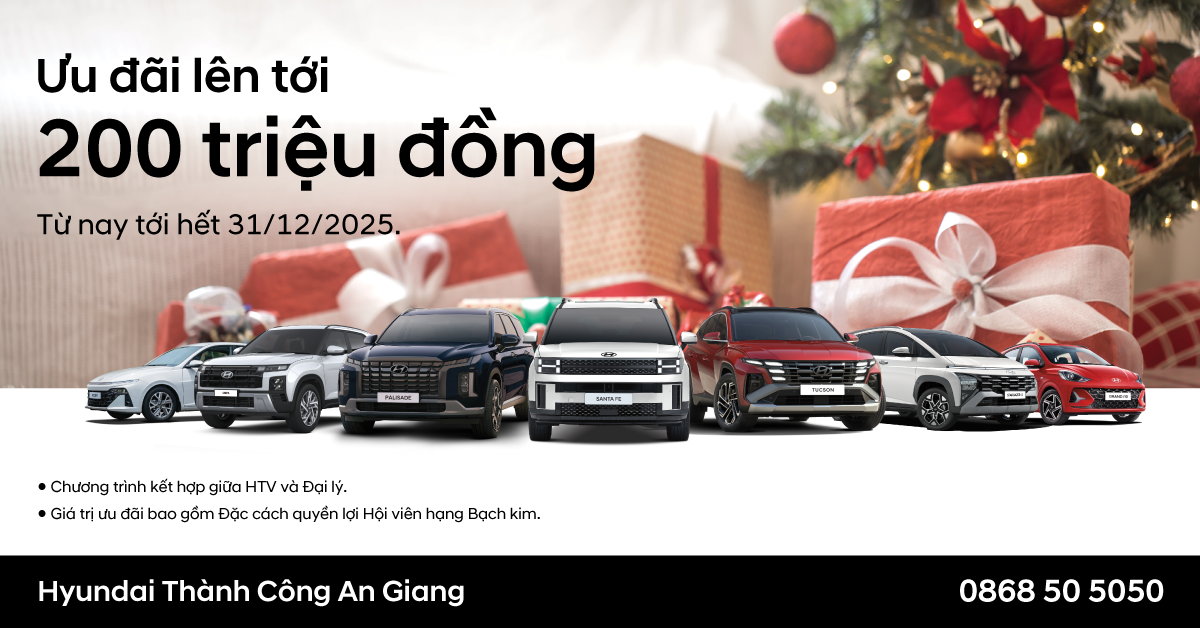 Cuối năm là thời điểm vàng để sở hữu xe Hyundai với hàng loạt ưu đãi tài chính hấp dẫn, hỗ trợ trả góp cao và gia hạn bảo hành lên đến 8 năm. Ngay trong tháng cuối cùng của năm, Hyundai An Giang triển khai chương trình ưu đãi đặc biệt dành cho khách hàng