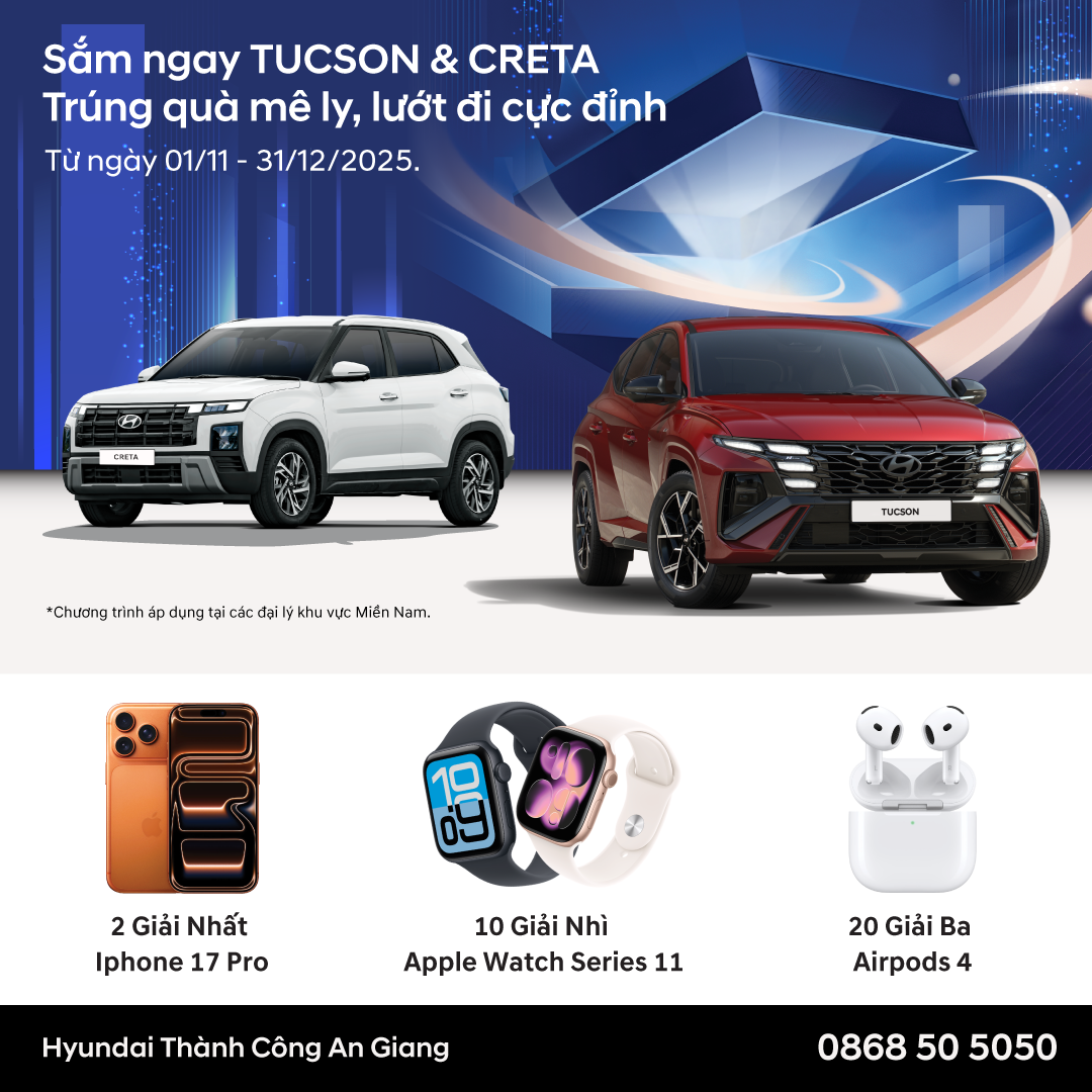 Cuối năm thêm rộn ràng quà tặng siêu HOT. Sắm ngay Hyundai Tucson hoặc Hyundai Creta tại 𝗛𝘆𝘂𝗻𝗱𝗮𝗶 𝗔𝗻 𝗚𝗶𝗮𝗻𝗴, khách hàng không chỉ sở hữu chiếc SUV phong cách – tiện nghi hàng đầu mà còn có cơ hội trúng ngay loạt quà công nghệ đỉnh cao