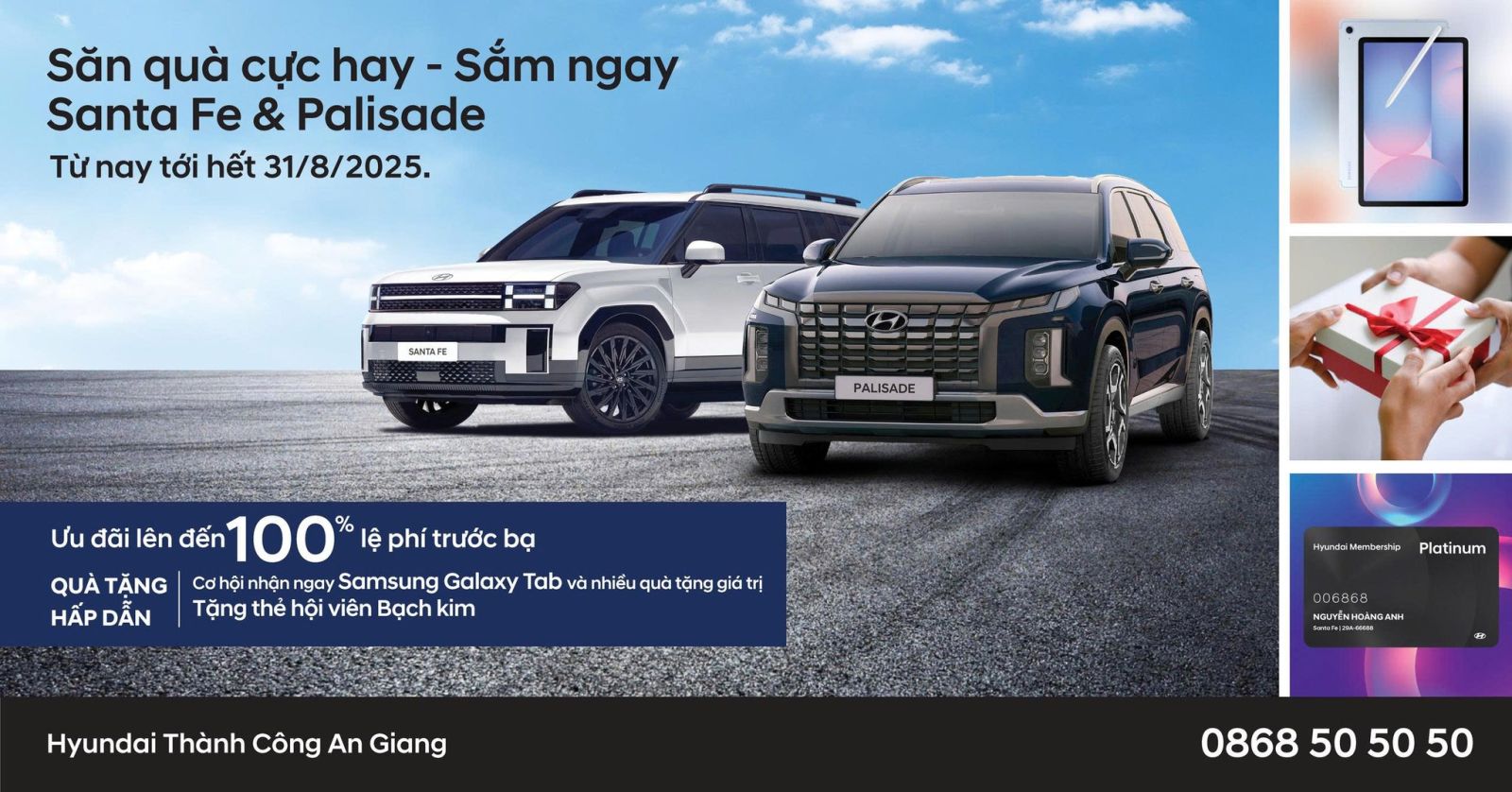 𝗛𝘆𝘂𝗻𝗱𝗮𝗶 𝗔𝗻 𝗚𝗶𝗮𝗻𝗴 triển khai Chương trình ưu đãi đặc biệt “Săn quà cực hay – Sắm ngay Santa Fe & Palisade” với giá trị lên đến 100% lệ phí trước bạ cùng nhiều phần quà giá trị.
