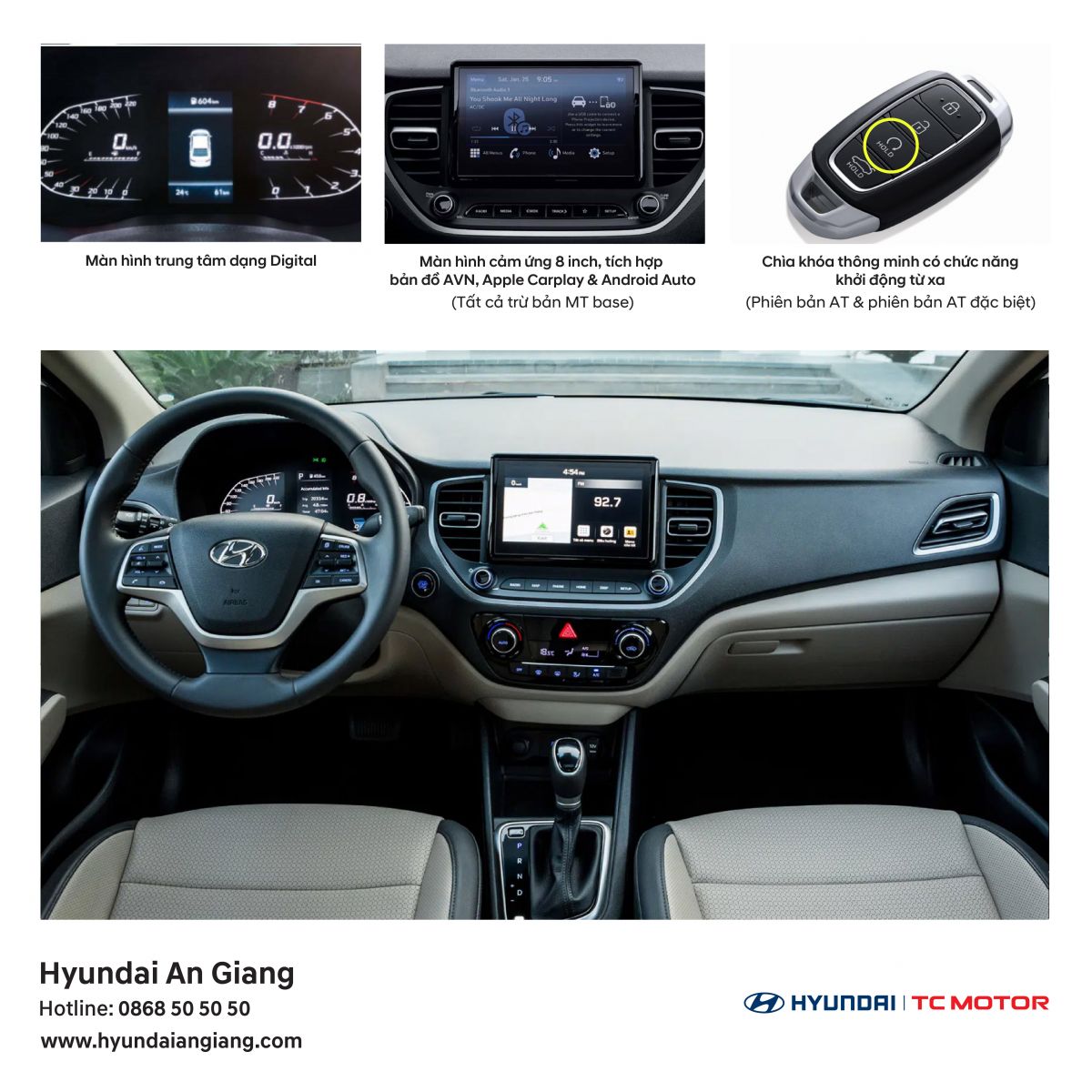 Nội thất của Accent hướng tới người lái với bảng điều khiển trực quan, dễ sử dụng kết hợp không gian rộng rãi cùng chất liệu chế tạo và trang bị công nghệ cao. Khu vực điều khiển trung tâm được bố trí theo chiều ngang, màn hình cảm ứng 8 inch tích hợp camera lùi. Cũng như những mẫu xe khác của Hyundai tại Việt Nam, Accent phiên bản nâng cấp được trang bị hệ thống giải trí hỗ trợ Bluetooth/USB/Mp4/Radio/AUX với 6 loa cùng kết nối Apple Car Play, Android Auto. Màn hình này có khả năng chia đôi nội dung hiển thị độc lập, tăng cường khả năng đa nhiệm.